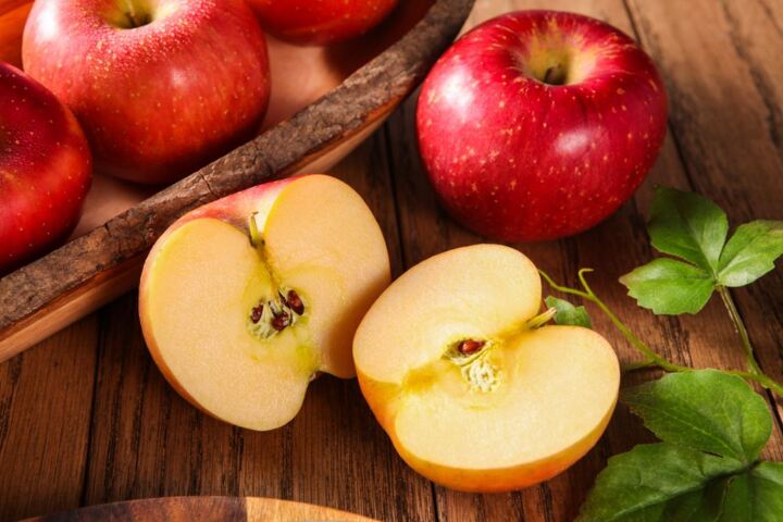 '펙틴'이라고 하는 수용성 식이섬유가 다량 함유된 사과입니다! 특히 아침에 먹는 사과는 금사과라고 불립니다. 아침 식사 후에 사과를 먹으면 장의 기능이 활발해지고 변을 보기 쉬워집니다. 다만 주의할 점이 있습니다. 늦은 밤에 사과를 먹으면 과도한 섬유질이 장을 자극하여 배변과 위액 분비를 촉진하고 예민하신 분은 위가 아프고 잠을 잘 못 이룰 수 있습니다.