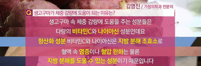 생고구마가 체중 감량에 도움이 되는 이유는 생고구마 속에 다량의 비타민C와 나이아신 성분은 혈액 속 염증이나 혈압 완화는 물론 지방 분해를 도와주는 성분이기 때문이에요.