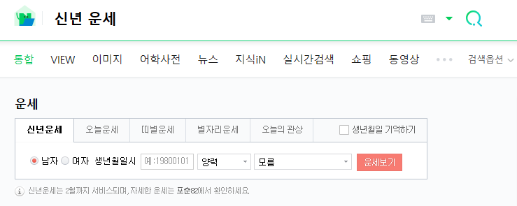 네이버 검색창에 신년 운세, 오늘 운세, 띠별 운세, 별자리 운세 등을 검색하면 바로 이용할 수 있어요.