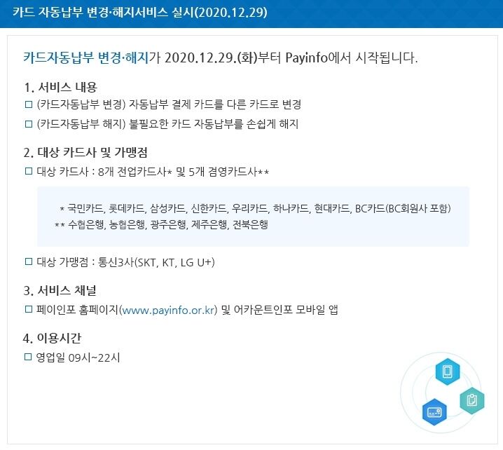 금융위원회는 해당 서비스 외에도 통신요금 등 카드 자동납부 변경과 해지도 통합 서비스를 도입했습니다.