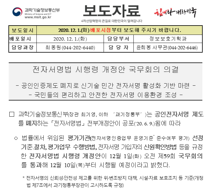 전자서명법 시행령 개정안 국무회의 의결 관련 보도자료 내용입니다. 자세한 내용은 첨부파일을 참고하시기 바랍니다. ※ 대용량 첨부파일은 바로보기가 지원되지 않으니, 첨부파일명을 클릭