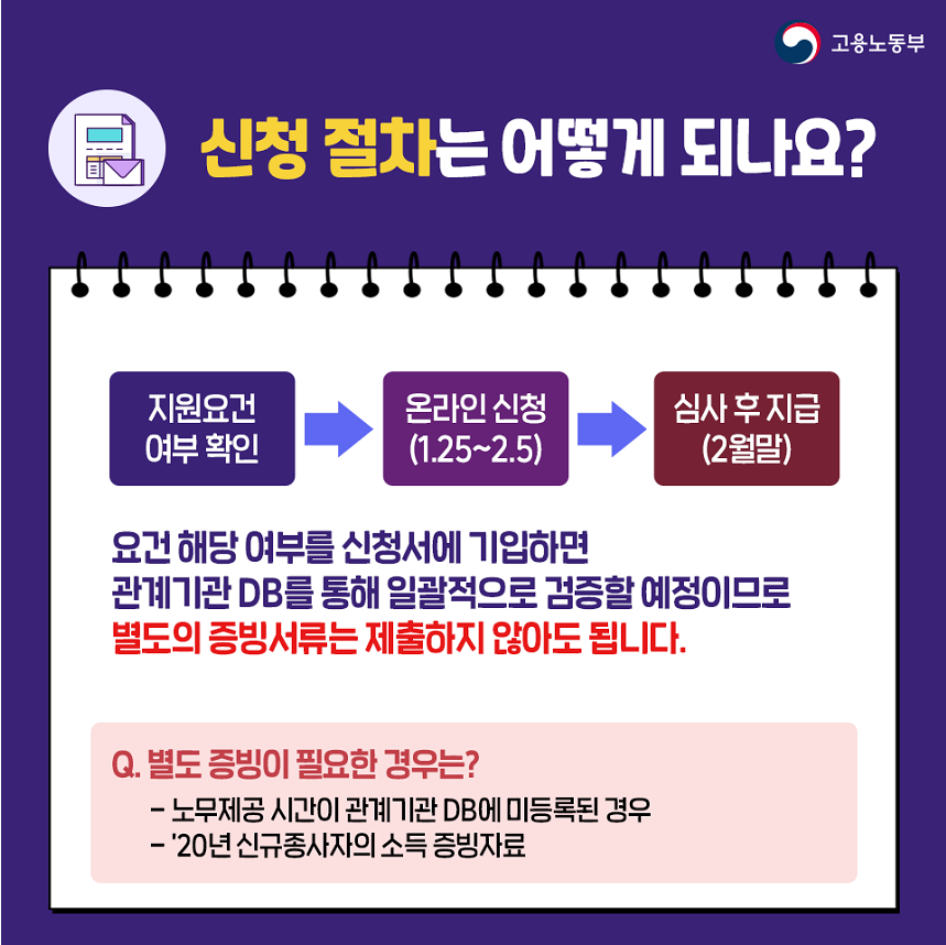지원요건 여부확인 → 온라인 신청(1.25~2.5) → 심사 후 지급(2월말)