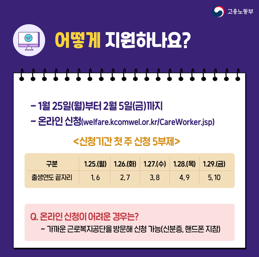 [베이비타임즈=김은교 기자] 근로복지공단(이사장 강순희)은 이달 25일부터 오는 2월5일까지 ‘방문돌봄종사자 한시지원금 사업’을 온라인 신청받는다고 26일 밝혔다. 방문돌봄종사자 및 방과