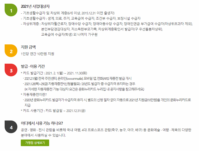 2020년에 비해 1만원 많아졌습니다. 2021년 기준 1인당 연간 10만 원이 지원됩니다. 문화누리카드 발급 기간은 2021년 2월 1일부터 11월 30일까지입니다. 2021년부터는 문화누리카드 발급자가 수급자격 유지 시, 별도의 신청 절차 없이 자동으로 지원금을 개인의 문화누리카드로 지급하는 자동 재충전 제도가 시행됩니다.