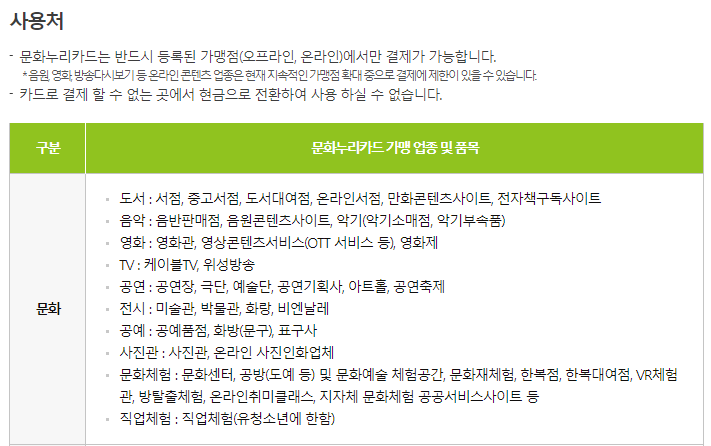 문화누리카드는 반드시 등록된 가맹점(온라인, 오프라인)에서만 결제가 가능합니다.