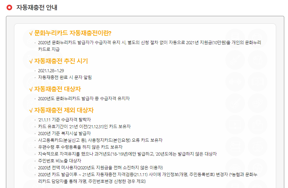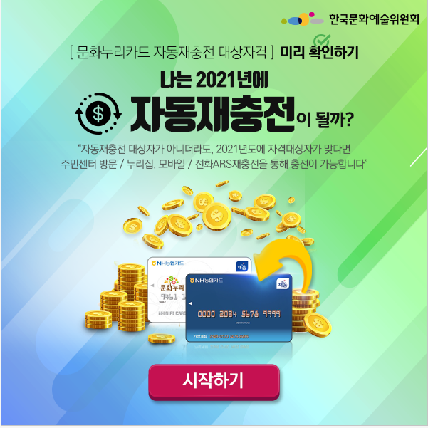 위 링크로 2021 문화누리카드 재충전 대상 자격을 미리 확인할 수 있습니다.