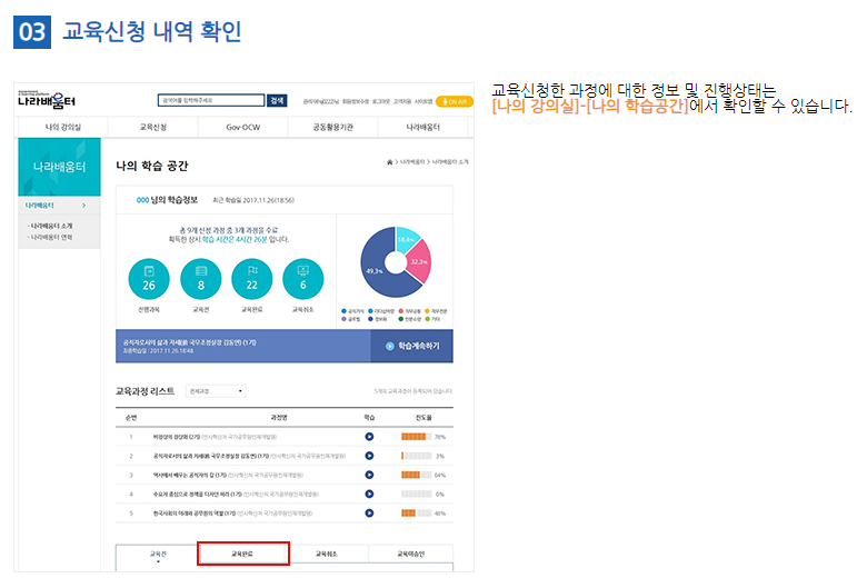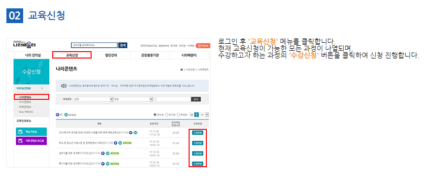회원가입 후 로그인을 하시면 교육일정 확인과 교육신청이 가능해요. 교육이 신청되면 나의 강의실에서 확인할 수 있습니다.