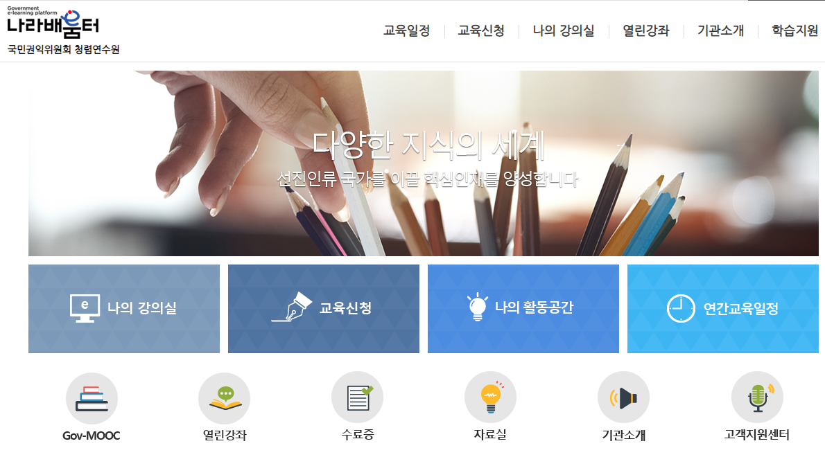 청렴연수원 나라배움터에 접속하시면 위와 같은 메인 화면이 보이실 거예요. 기본적으로 다양한 교과목이 준비되어 있으니 원하시는 여러 가지를 배울 수가 있습니다.