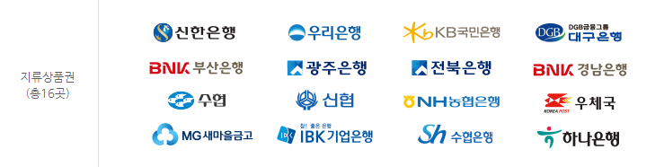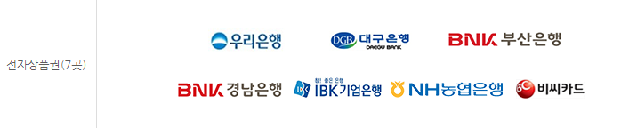 우리은행, 기업은행, 농협, 비씨카드, 대구은행, 부산은행, 경남은행 총 7군데입니다.