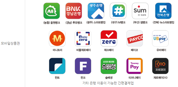 구매 가능한 은행은 신한은행, 국민은행, 우리은행, 하나은행, 부산은행, 대구은행, 광주은행, 전북은행, 경남은행, 수협, 신협, 농협은행, 우체국, 새마을금고, 기업은행, 수협은행 총 16군데입니다.