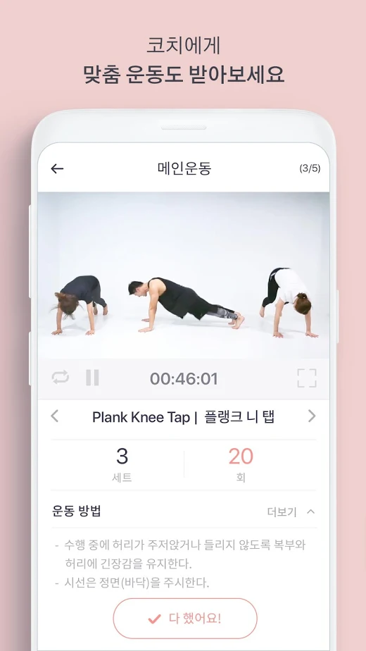 줄여서 '모트'라고 불리는 모두의 트레이닝은 헬스 PT가 부담스러워하는 사람에게 좋은 대안이 될 수 있는 어플입니다. 전담 코치의 일대일 PT서비스를 온라인으로 받을 수 있기 때문이에요. PT 1회 정도 가격인 월 7만 9천 원만 내면 한 달 동안 나만의 담당 PT코치가 배정됩니다. 그 날 먹은 메뉴를 사진으로 찍어 보내면 체크하고 피드백을 해 주는 운동 코스는 영상을 통해 따라갈 수 있습니다. 또 식사 관리가 어려운 사람에게 저염식, 저탄식, 균형식, 양 조절 등 다양한 식단의 예시를 사진으로 보기 좋게 설명하기 위해 비교적 손쉽게 식단 관리를 할 수 있습니다.
